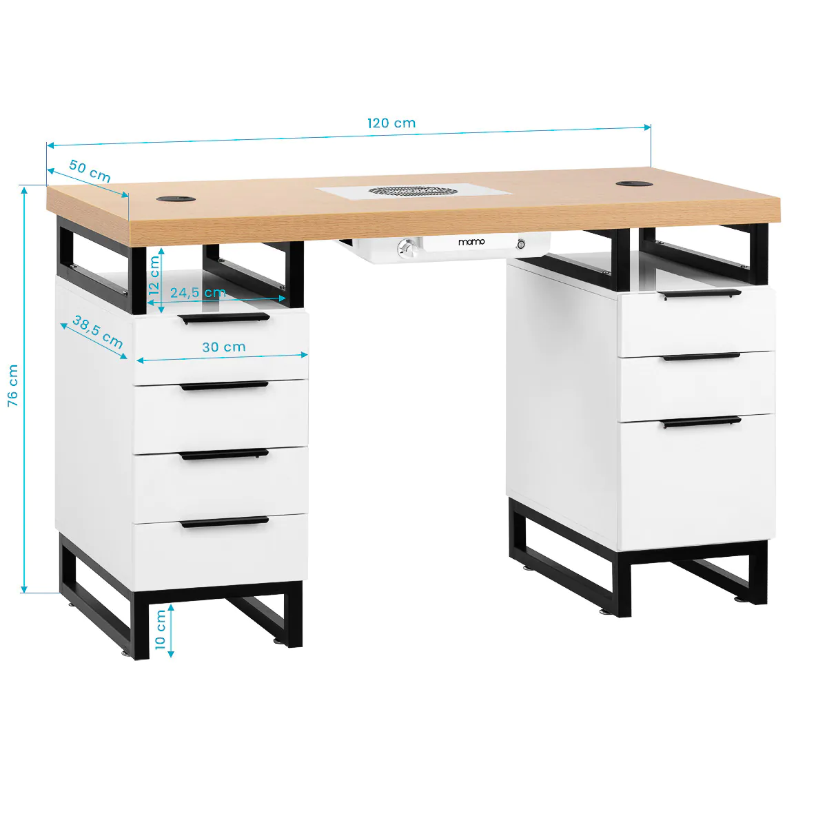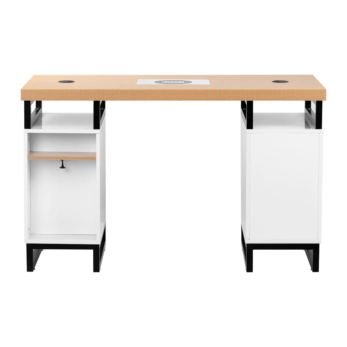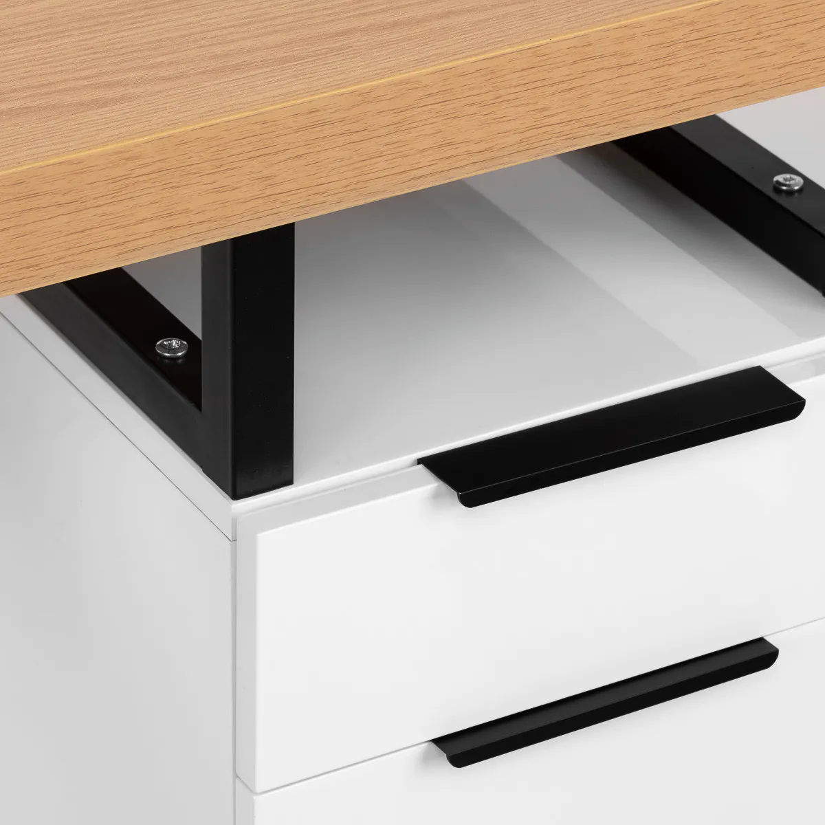 Kombinacija toplega lesa, belih front in črnega kovinskega ogrodja daje mizi eleganten, moderen videz – primeren za vsak sodoben salon.