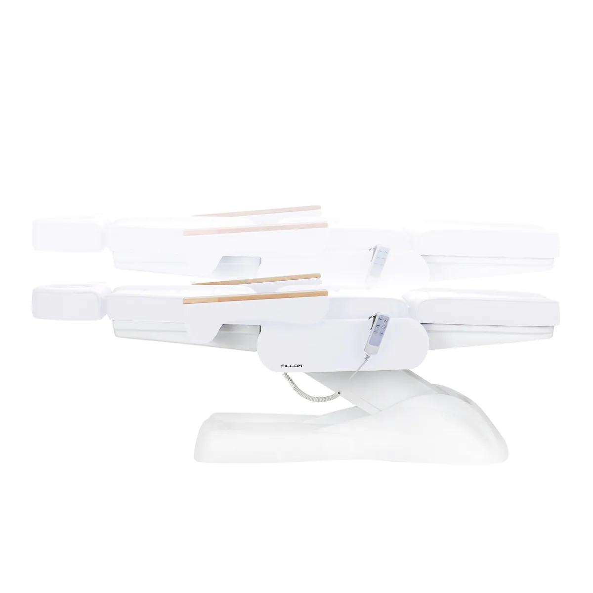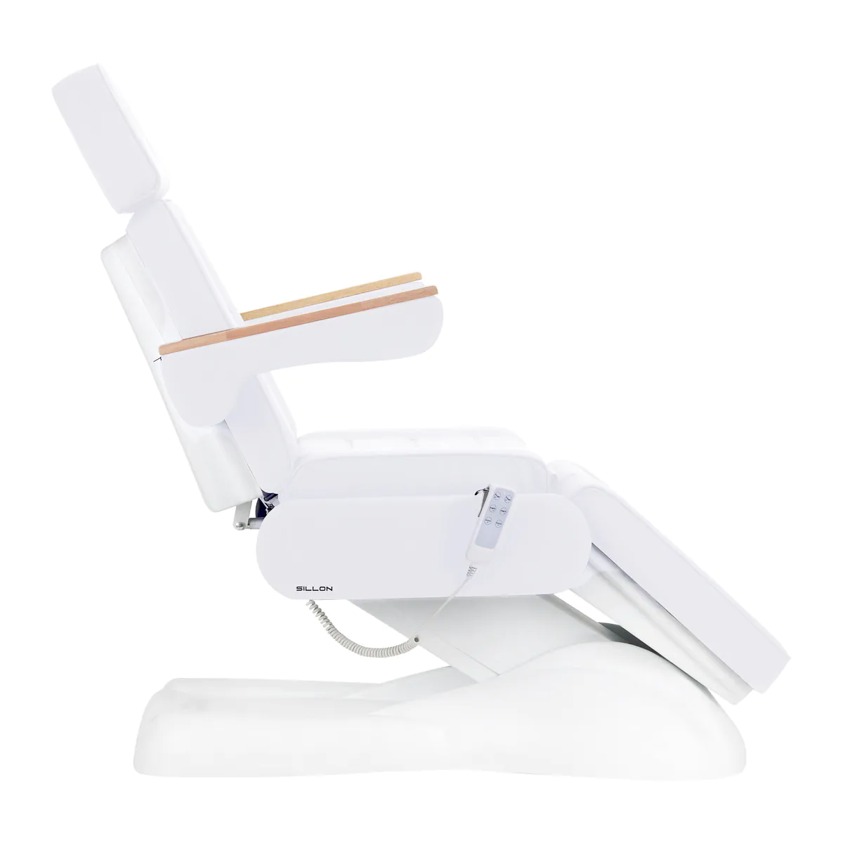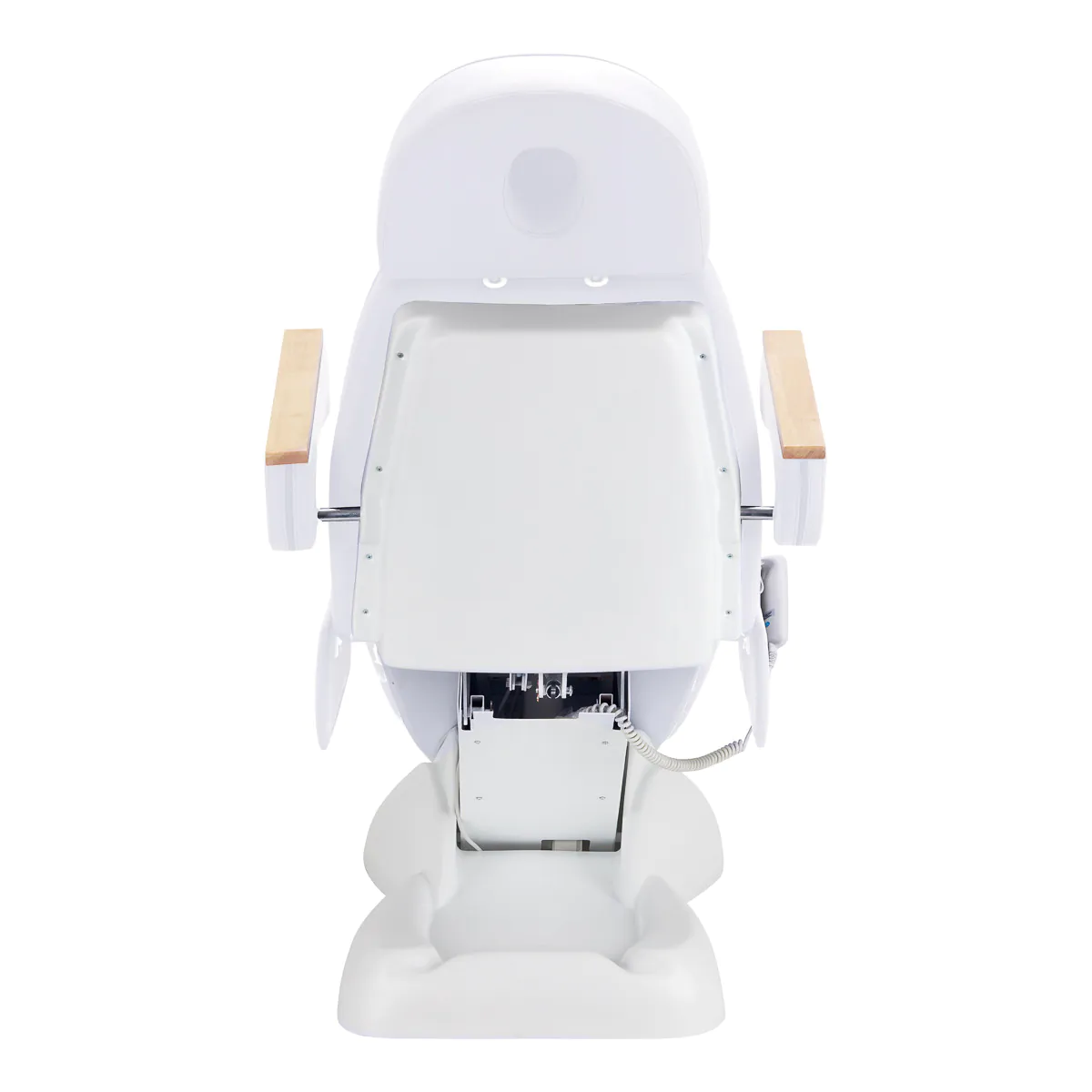 Elegantno oblikovan profesionalni stol z električnim upravljanjem s 3 motorji (višina, naslon za hrbet in noge). Ponuja popolno prilagodljivost, udoben sedež in premične naslone za roke. Primeren za različne tretmaje – od neg do masaž. Prevlečen z umetnim usnjem, enostaven za čiščenje. Vključuje raztegljiv vzglavnik z odprtino za obraz in stabilno konstrukcijo. Vrhunska izbira za vsak sodoben salon.